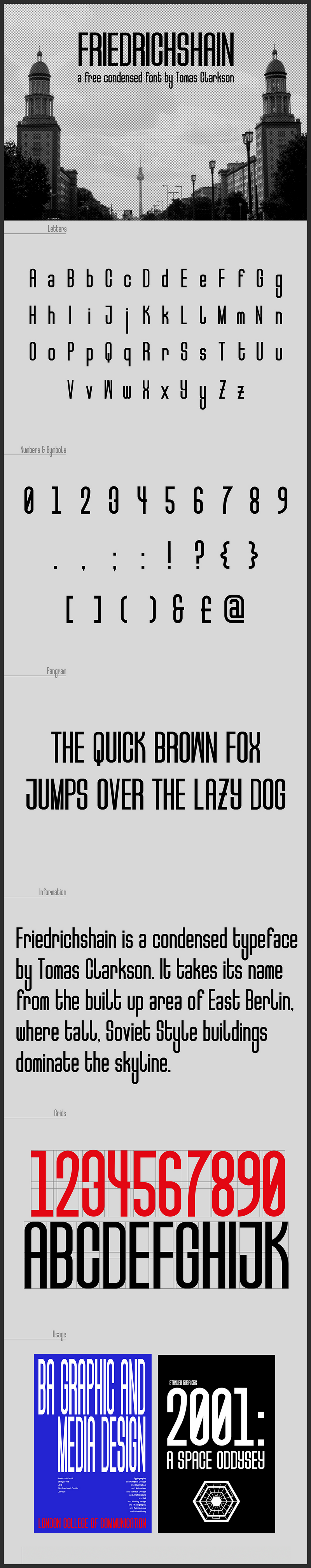 Friedrichshain is a condensed typeface created by Behance user Tomas Clarkson. It takes its name from the built-up area of East Berlin, where tall, Soviet Style buildings dominate the skyline. It features basic punctuation symbols, numerals, and Uppercase/Lowercase characters.