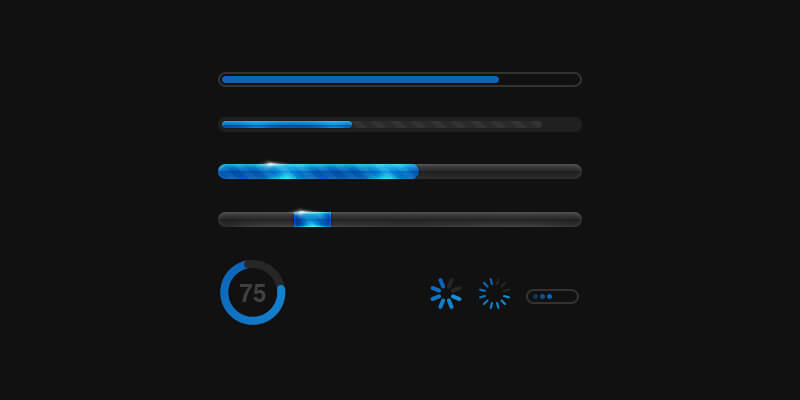 A fantastic set of eight blue loading elements with interesting lighting details. There are three different styles: Bars, circles and small spinners. The PSD has been provided by the guys at 365PSD in case you’d like to make any modifications.
