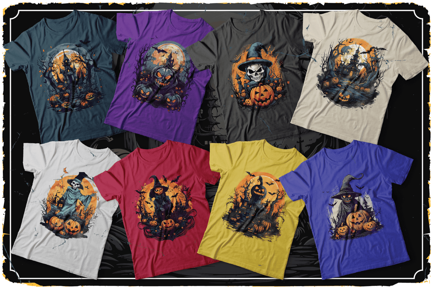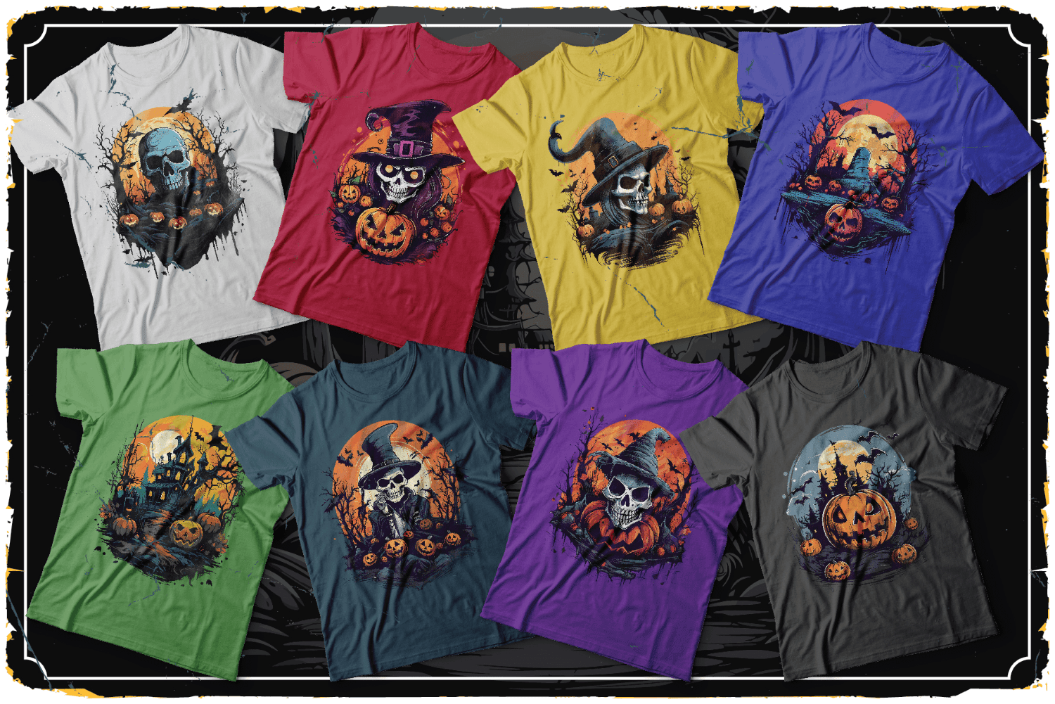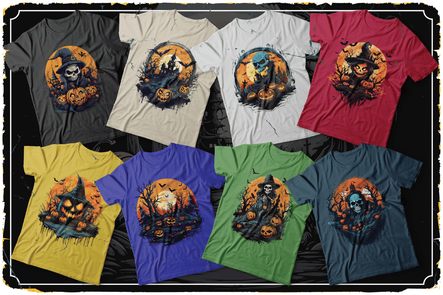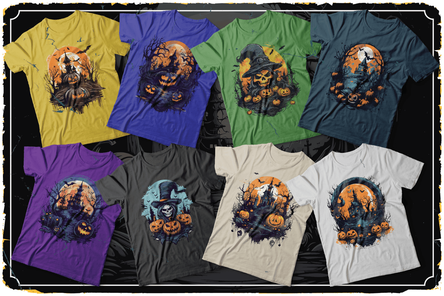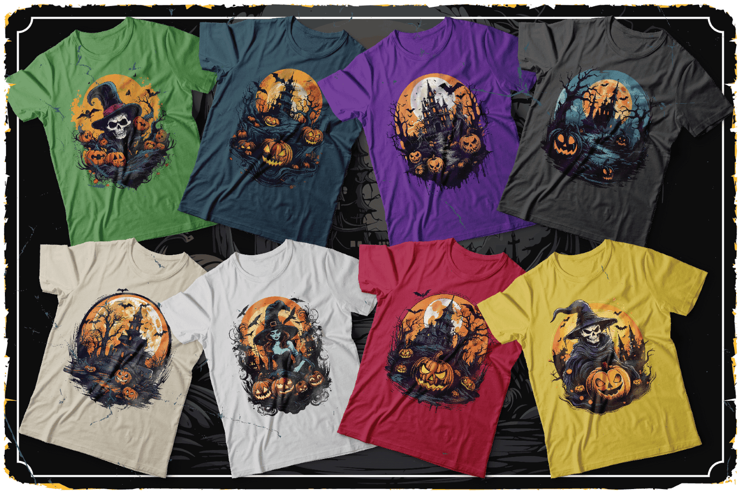 A big bundle of Halloween t-shirt designs featuring vector and print-ready illustrations of witches, pumpkins, skeleteons, skulls, castles and more, perfect for print on demand merch for the upcoming halloween season