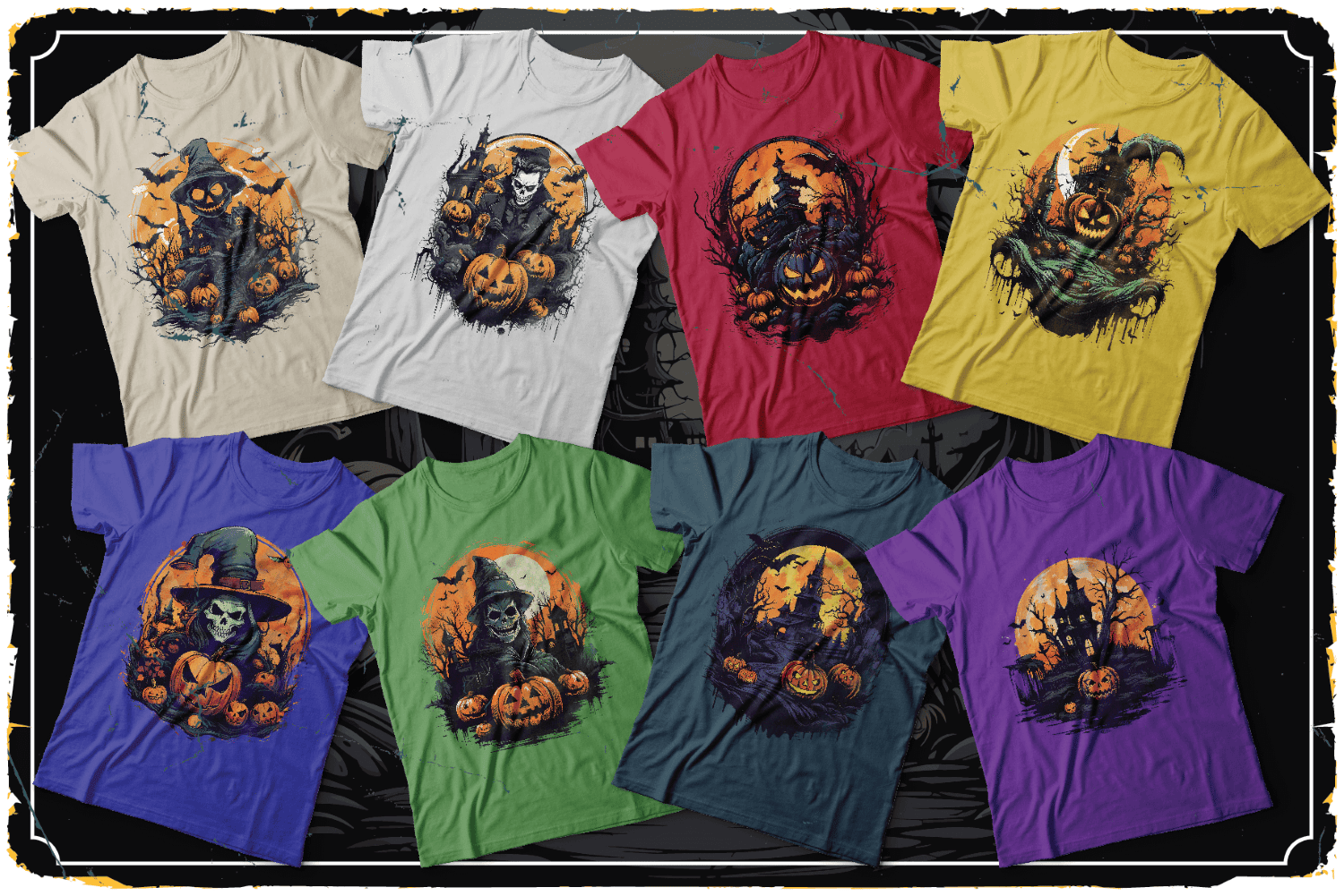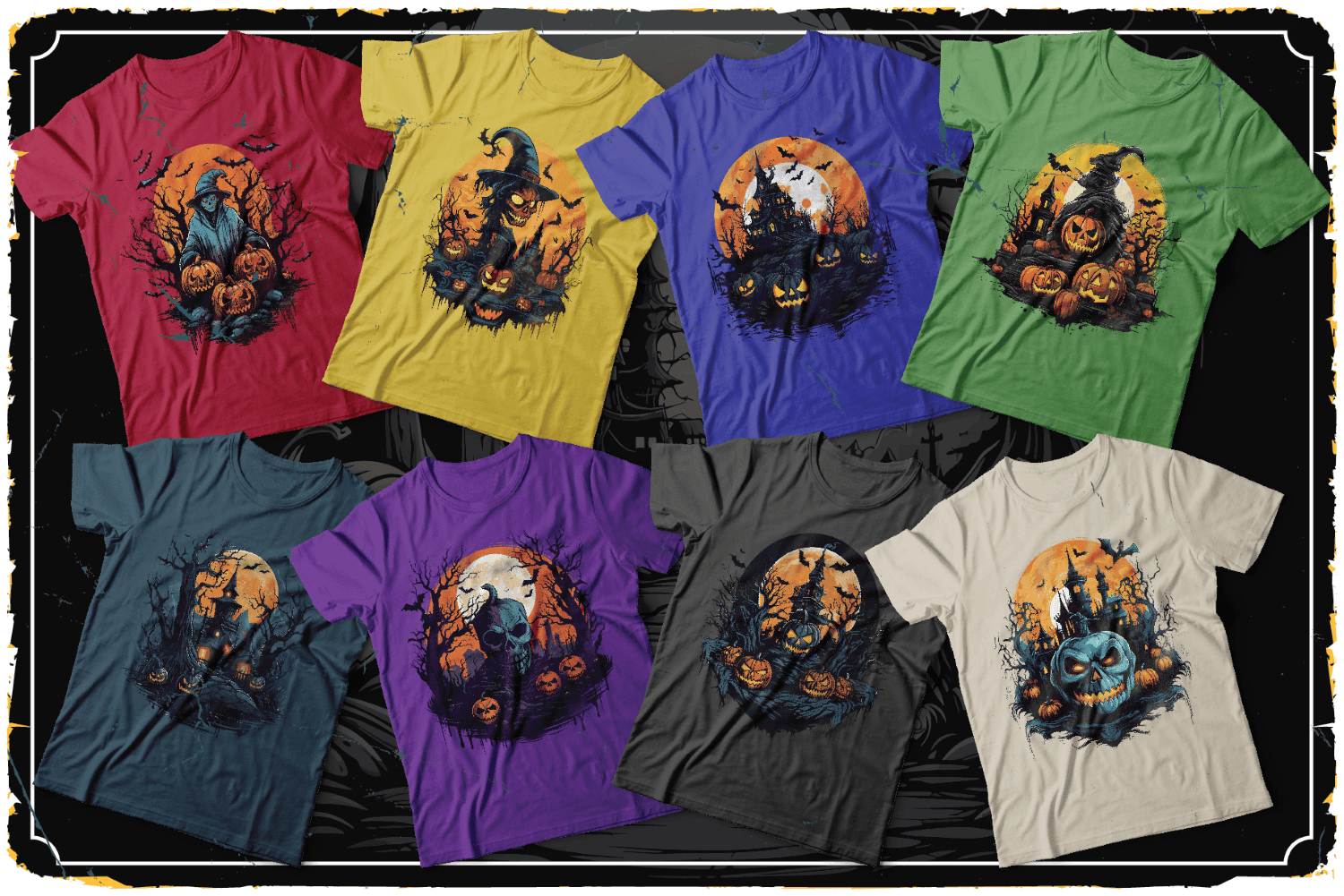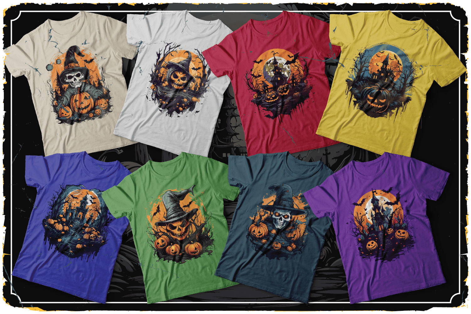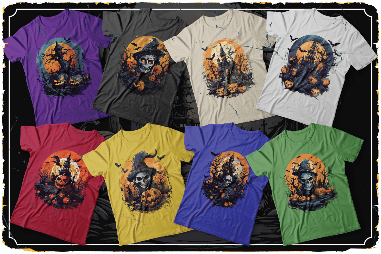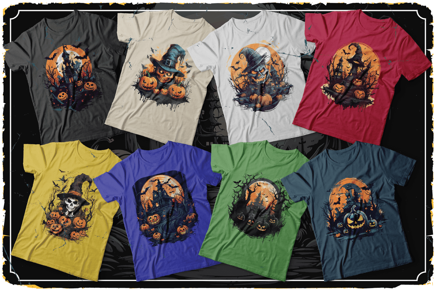 A big bundle of Halloween t-shirt designs featuring vector and print-ready illustrations of witches, pumpkins, skeleteons, skulls, castles and more, perfect for print on demand merch for the upcoming halloween season