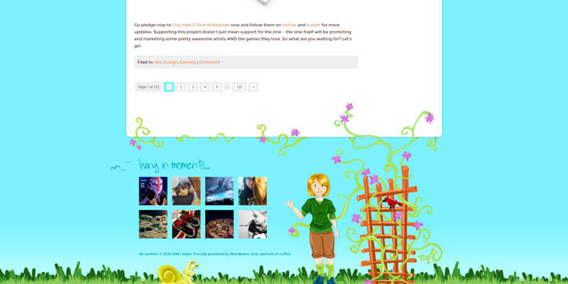 A beautifully hand drawn footer design that consists of an illustration that features a small thumbnail grid portfolio and a seamless link to go to the top of the page made out of creepers.