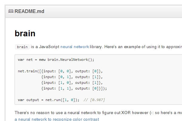 brain is a JavaScript neural network library. Here’s an example of using it to approximate the XOR function:There’s no reason to use a neural network to figure out XOR however (-: so here’s a more involved, realistic example: