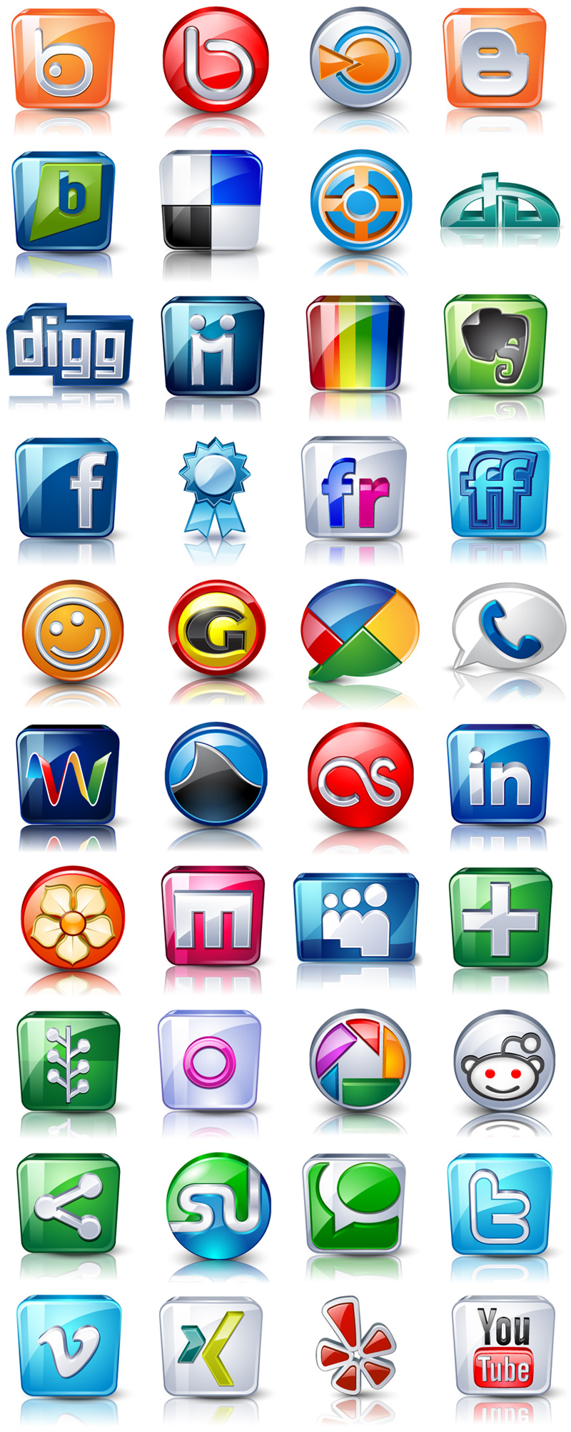 A set of high detail icons representing the most representative social networks that comes in both AI and PNG files of 512 pixels. These icons feature a glossy 3D style and present a very nice and reflection on the floor.
