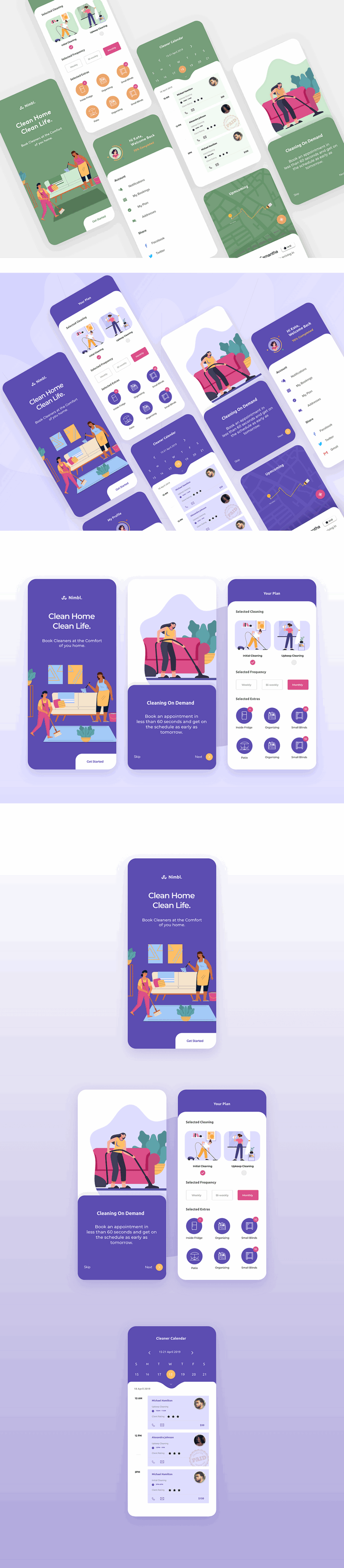 Сheck out a new concept for house cleaning. Trendy screens to choose different features. The app also has a version for the cleaners where they can manage their bookings and watch their calendar closely. Created by Dribbble user Shivangi Mahajan