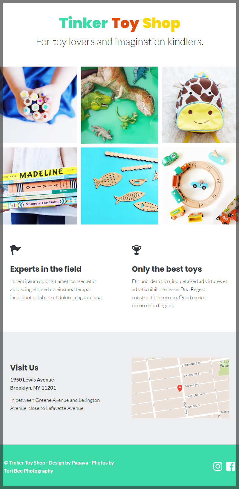 Tinker is a bright and playful website template created by Papaya featuring a simple grid-based design to showcase products from stores/portfolios. The grid images feature CSS color overlays on mouse over that display the name and price of the products, and at the bottom of the template, you’ll find the about panel with social icons as well as a panel for displaying the store’s location on a map.