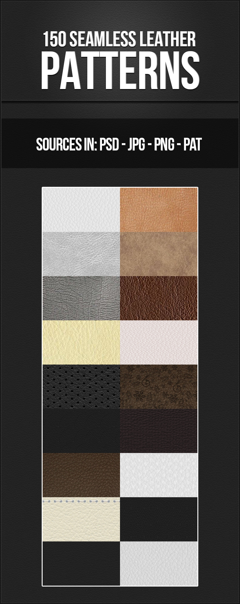 A huge pack of 150 seamless leather patterns that come in PSD, JPG, PNG and PAT formats. Among the many styles of leathers, you’ll find several texture rugosities, designs, adorns, and colors suitable for a wide range of projects.