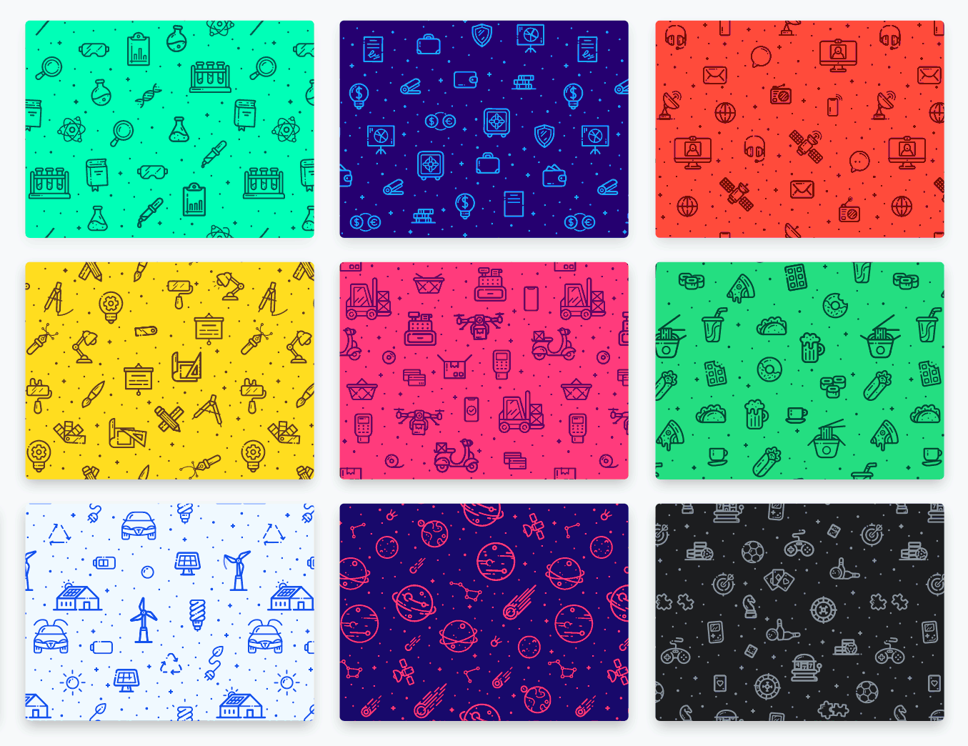 The pack includes 10 unique seamless patterns in 10 color variations. The seamless patterns can be used for any kind of presentation.