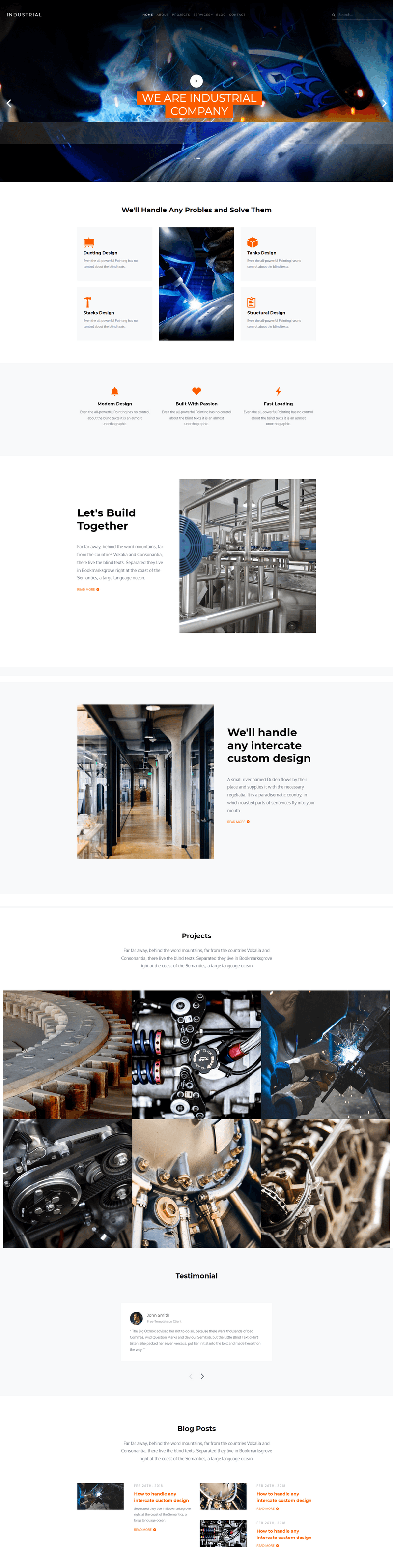 This free template created specially for any industrial, manufacturer, engineering or construction website. It was created using HTML5, Bootstrap 4, jQuery and SCSS.