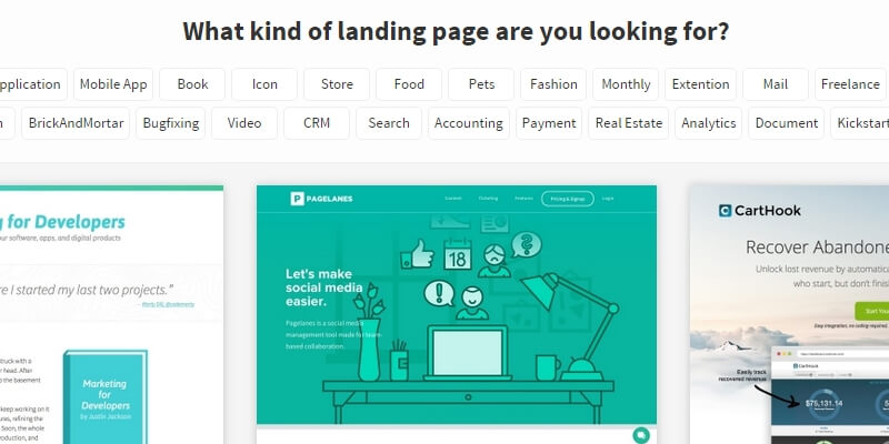An online collection of landing page designs for inspirational purposes that can be sorted by category or popularity.