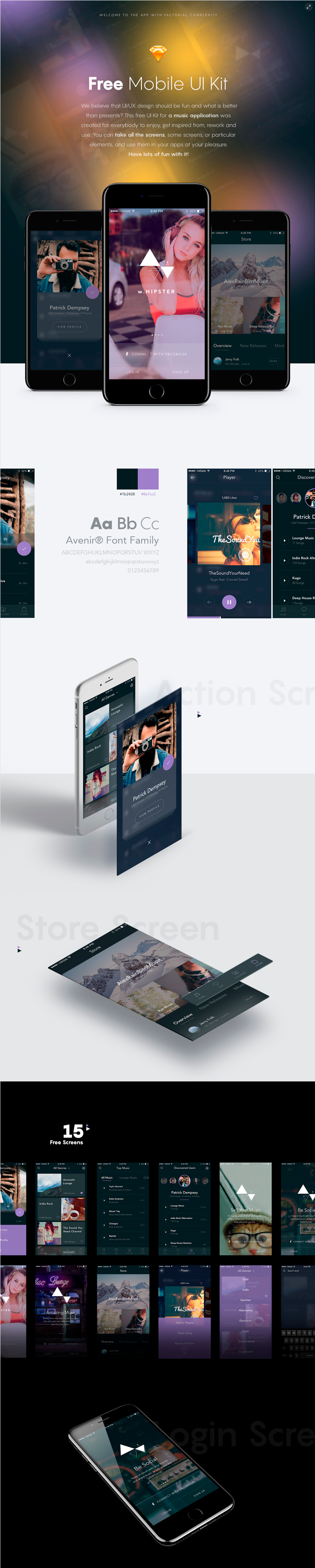 This is a UI kit for an iOS music app with all screens in PNG and Sketch format. The screens are fully editable and can be used together or separately for projects. The file’s size is 142 MBs.