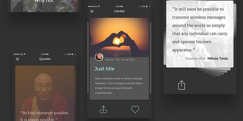 iOS UI Kit with 21 screens specially designed for iPhone 6 in a dark, flat style and outlined icons. This kit was crafted by Volodymyr Kurbatov and delivered under an attribution 3.0 unported license. It weighs about 145MB