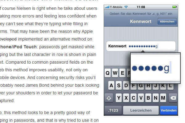 07.07.2009  ·  Stefan Ullrich zu den Themen Formulare, iPhone und jQuery. 73or: Delayed password masking with JavaScript.8/19/09 FYI: Upcoming version of the plugin will be released in a few days. It’s gonna fix the current issues very well.Jakob Nielsen recently asked us to Stop Password Masking:Usability suffers when users type in passwords and the only feedback they get is a row of bullets. Typically, masking passwords doesn’t even increase security, but it does cost you business due …