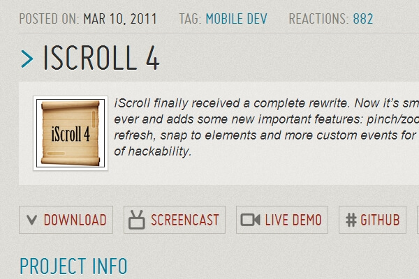 iScroll finally received a complete rewrite. Now it’s smoother than ever and adds some new important features: pinch/zoom, pull down to refresh, snap to elements and more custom events for a higher level of hackability.