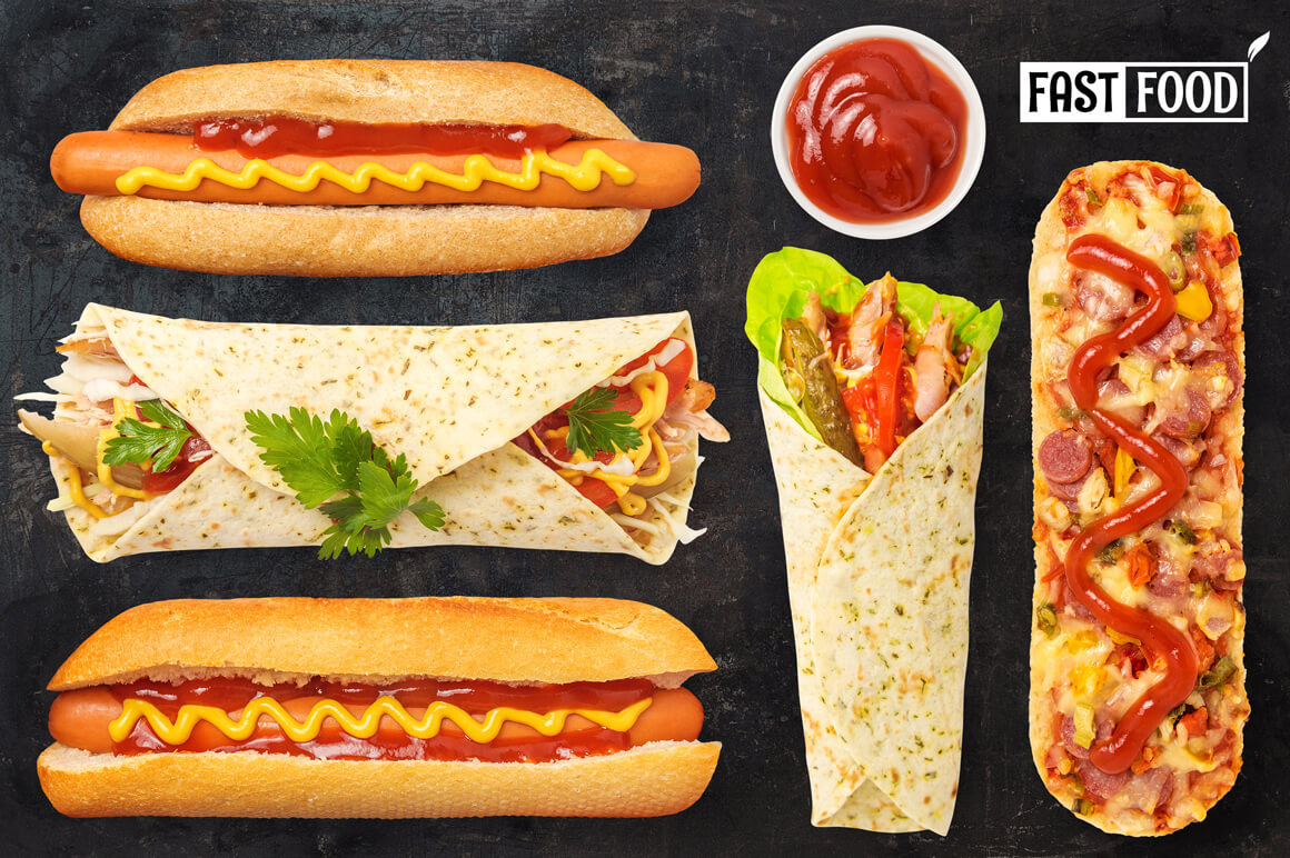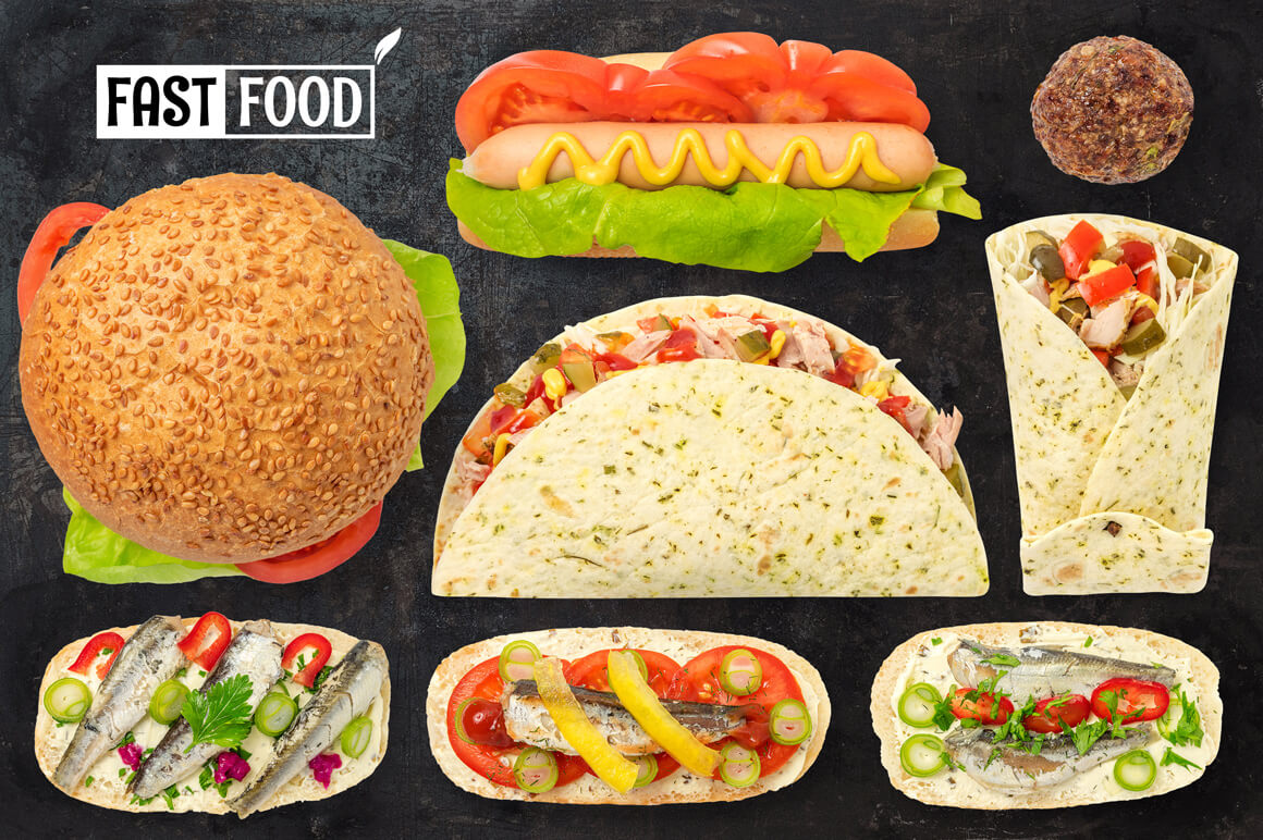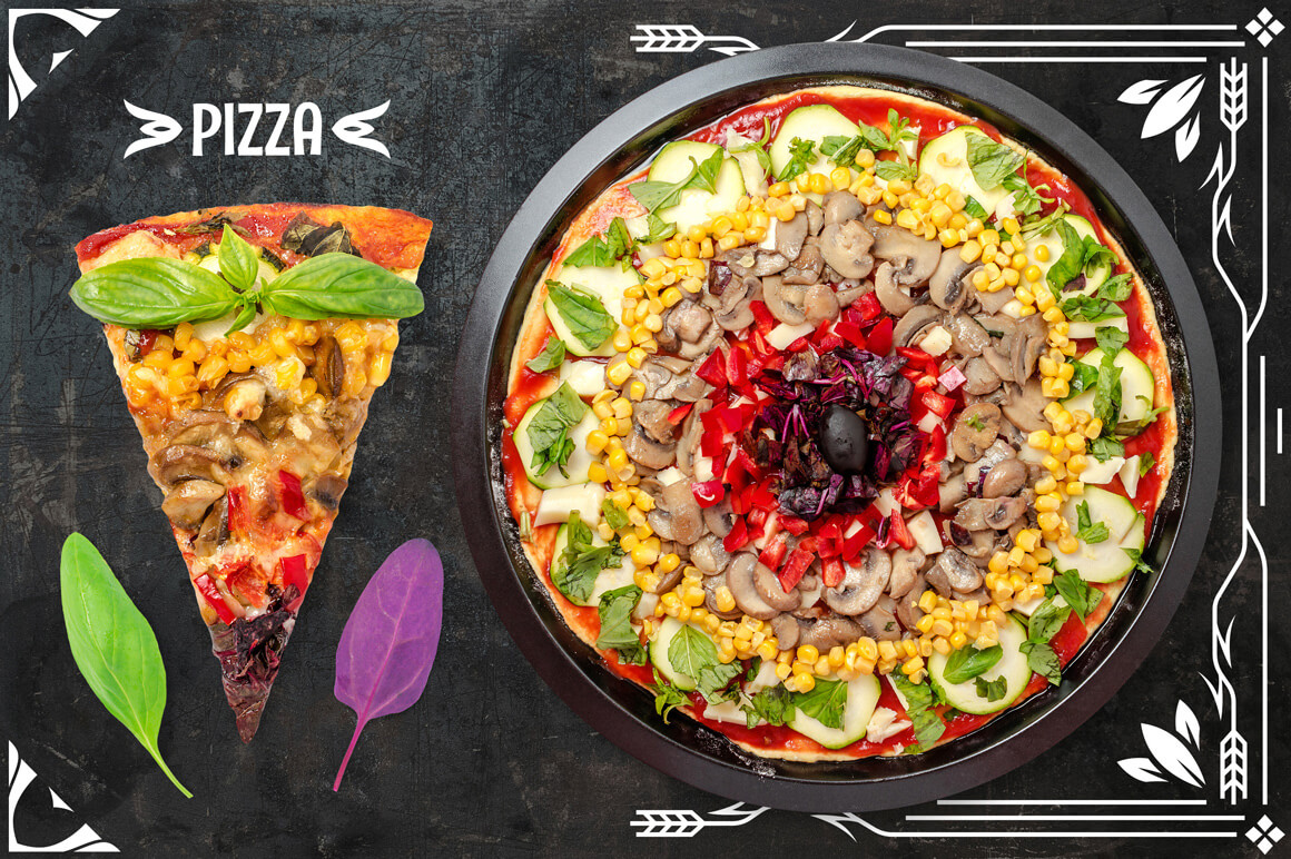 Contain 8 PSD and 42 PNG files with hot dog, tortilla, pizza baguette, ketchup, bruschetta with fish, hamburger, meatball, pizza collection, mini pizza, slices of pizza, pizza on a tray, basil leaf, red orach leaf, etc.