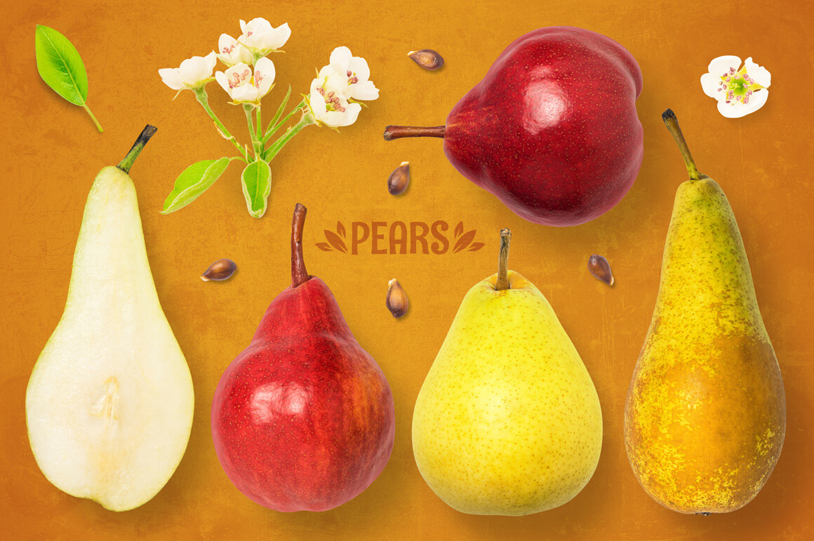 Contain 4 PSD and 44 PNG files with apples green and red, leaves, seeds, coconuts, grapes, pears, flowers.