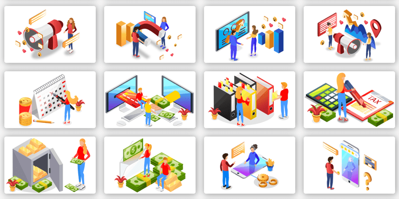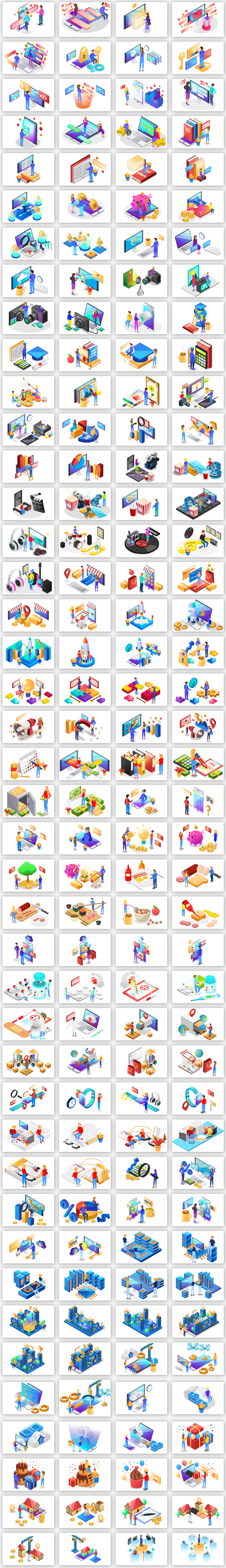 An amazing freebie containing 170 isometric illustrations and more than 420 assets delivered in PNG, SVG, and AI files. Find out more vector illustrations collections