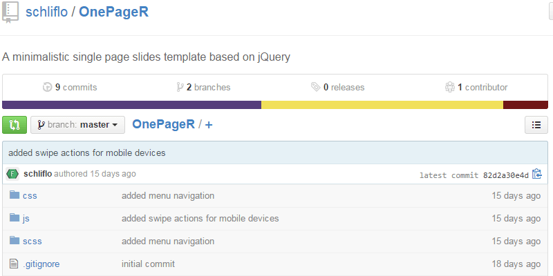 OnePageR is a minimalistic jQuery vertical slider template with smooth transitioning. It requires minimal code, it’s really flexible, allows full-screen slides, and includes three navigation methods: