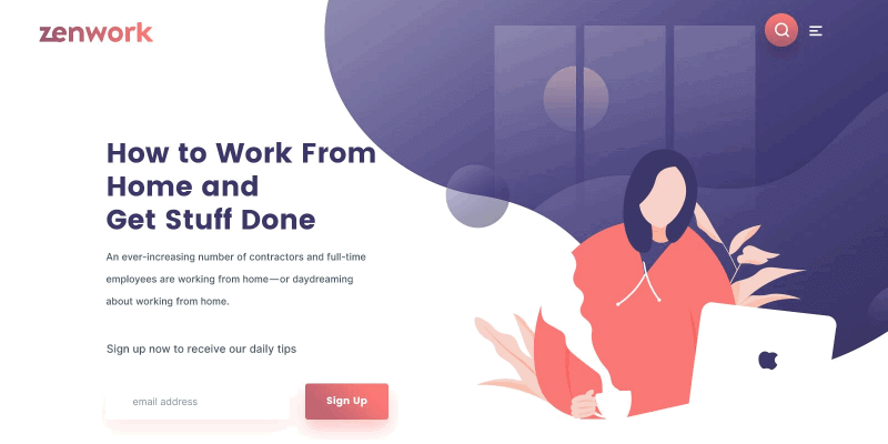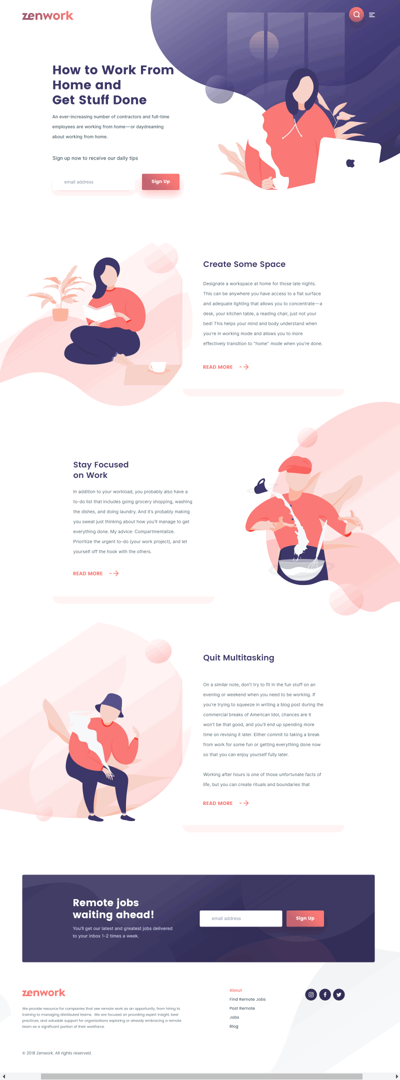 This is a layered landing page design for freelancer and remote workers with a delicate and feminine touch. It contains flat style illustrations and minimalist layout in PSD format file. Designed by  Aryo Pamungkas.