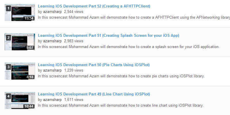 Amazing list  with more than 50 free and useful screencasts for iOS developers. From zero to app. Available on Youtube.