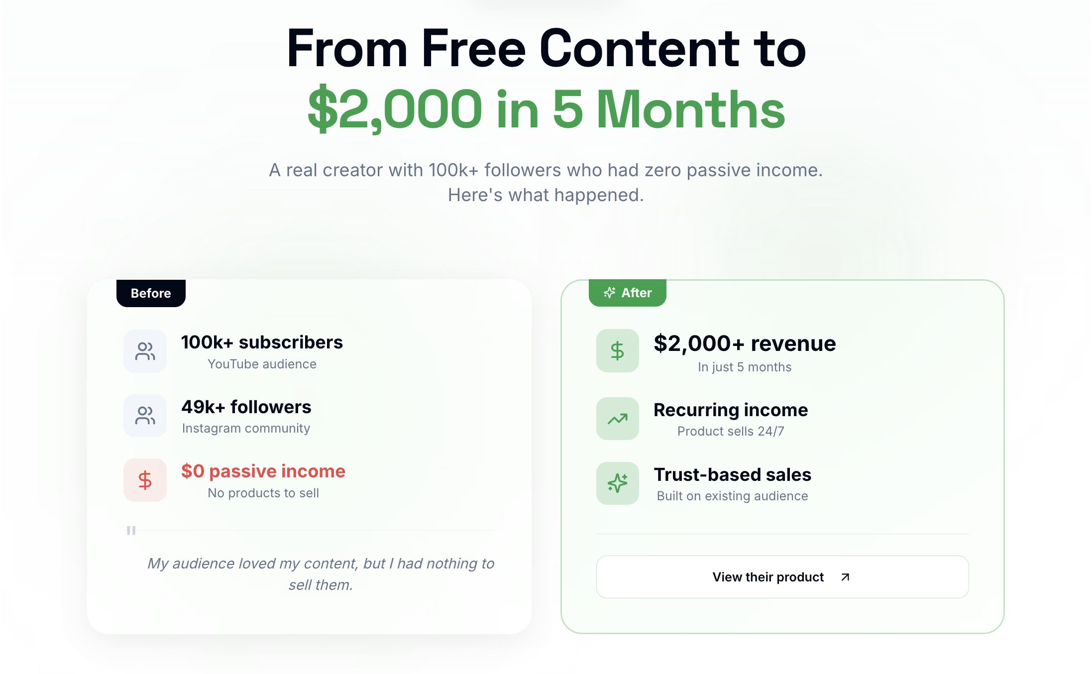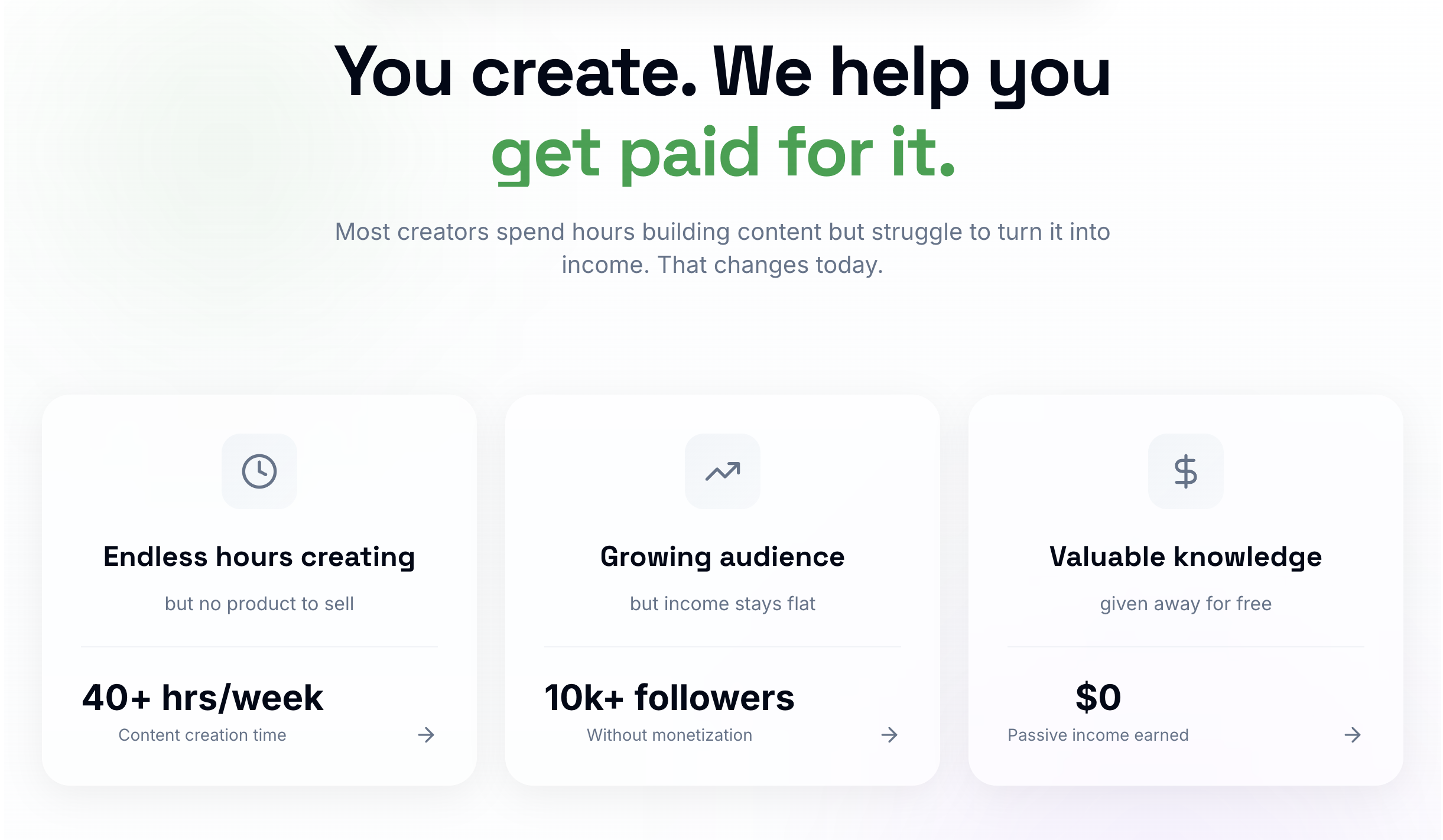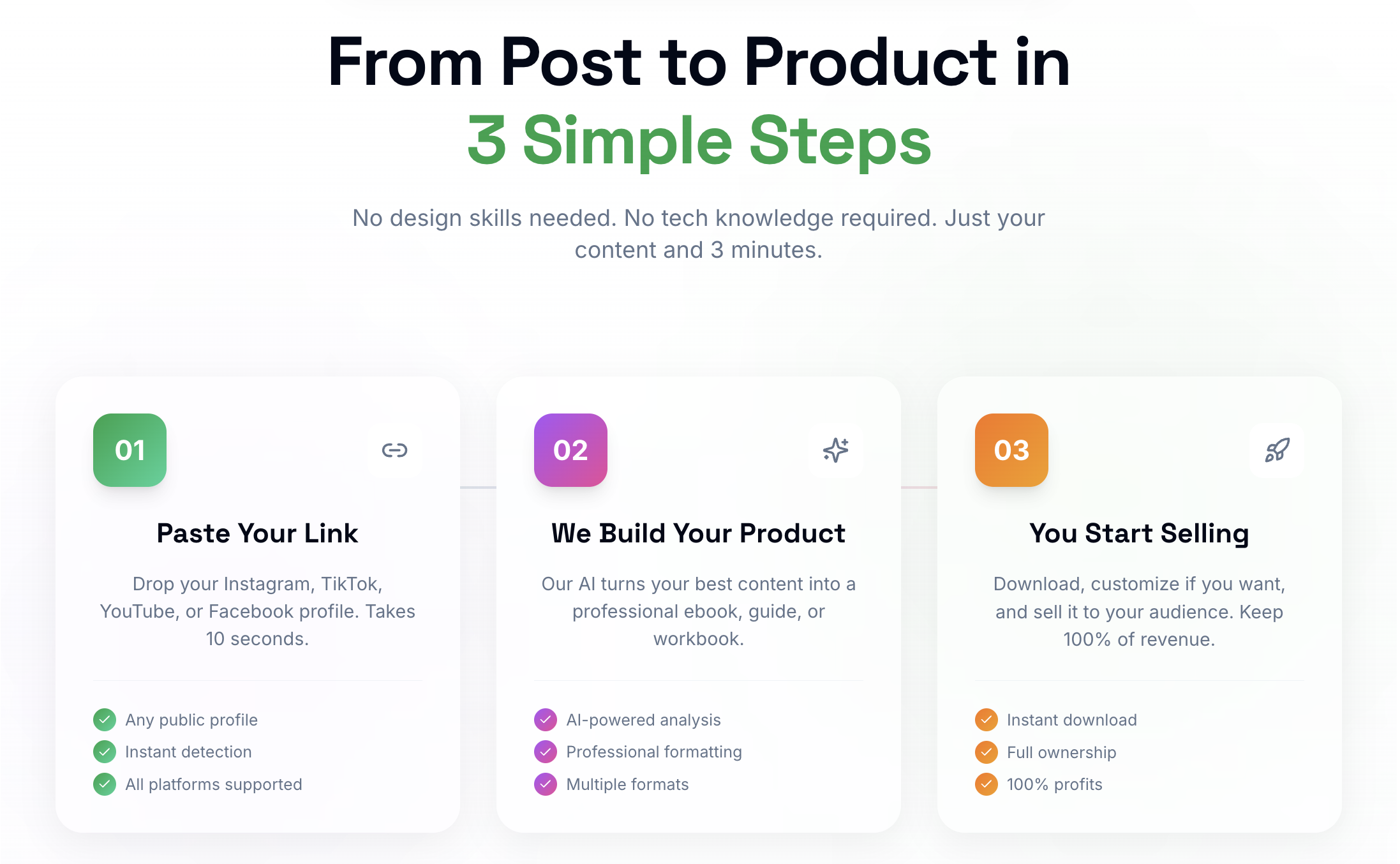 Instead of manually copy-pasting content, the platform analyzes your entire body of work across multiple platforms to identify patterns, validate real audience demand, and transform insights into structured digital products ready to sell.