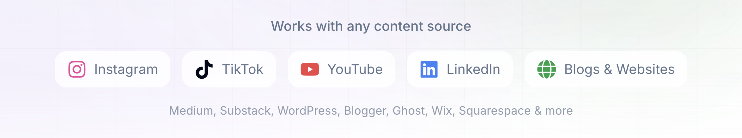 - Multi-Platform Support: Instagram, TikTok, YouTube, Facebook, LinkedIn, personal websites, and any blog or RSS feed.