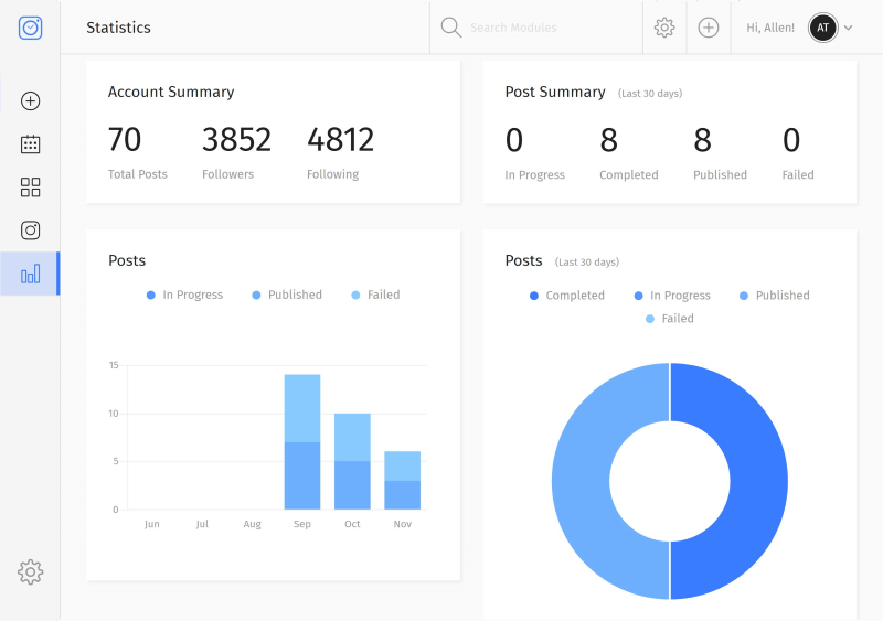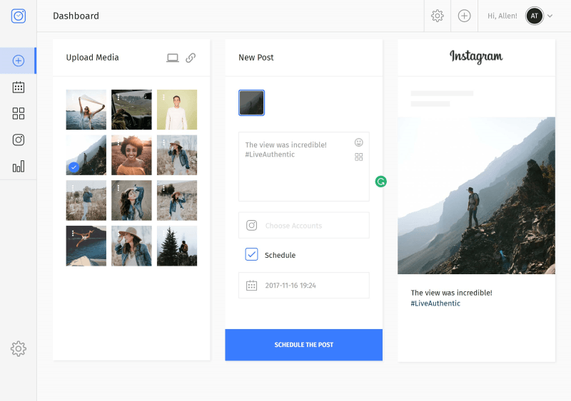 You can integrate with Dropbox, manage up to 25 instagram accounts, check out statistics, and schedule any kind of content, all from one dashboard to keep things simple and completely secure through instagram’s API
