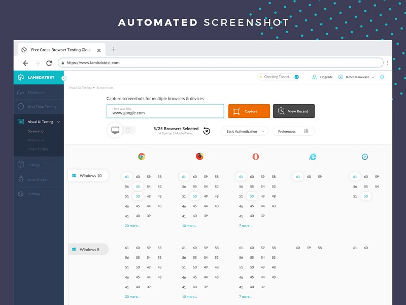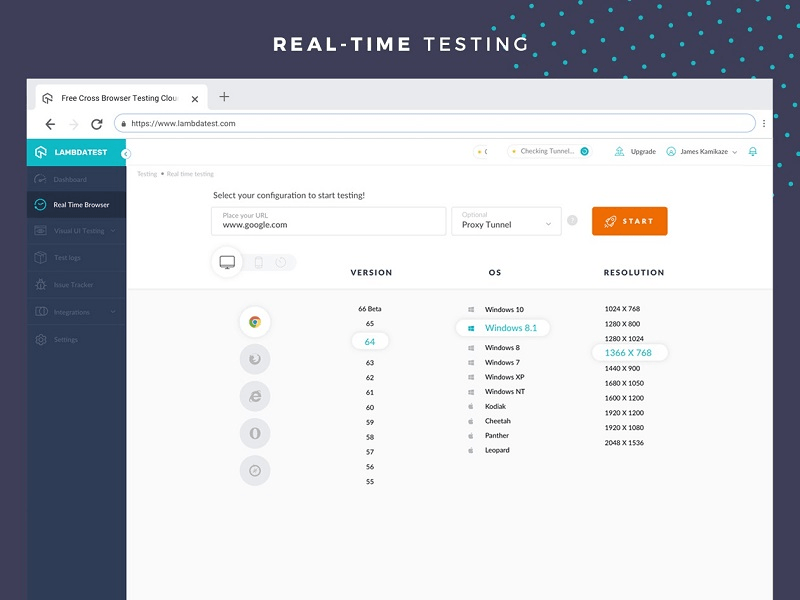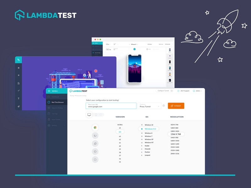 LambdaTest is a cloud based platform that helps you perform cross browser compatibility testing of your web applications or websites to make sure they look pixel perfect across all browsers, browser versions, resolutions, OS, desktop & mobile devices.