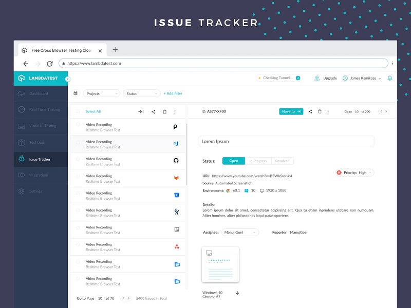 Log issues instantly during test sessions and collaborate with your team through our in-built issue tracking tool while performing cross browser testing. You can create, view, edit, and and assign issues to team members