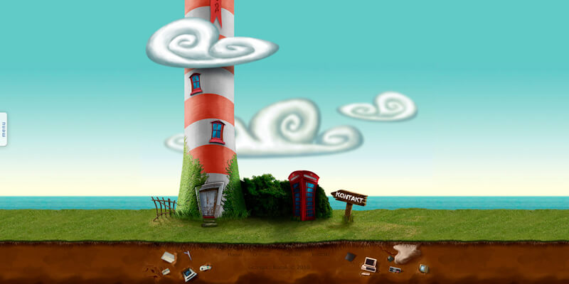 Quite a creative footer design that features the bottom of a light-house that features a side-cut piece of land with a contact link placed on a part of the illustration.
