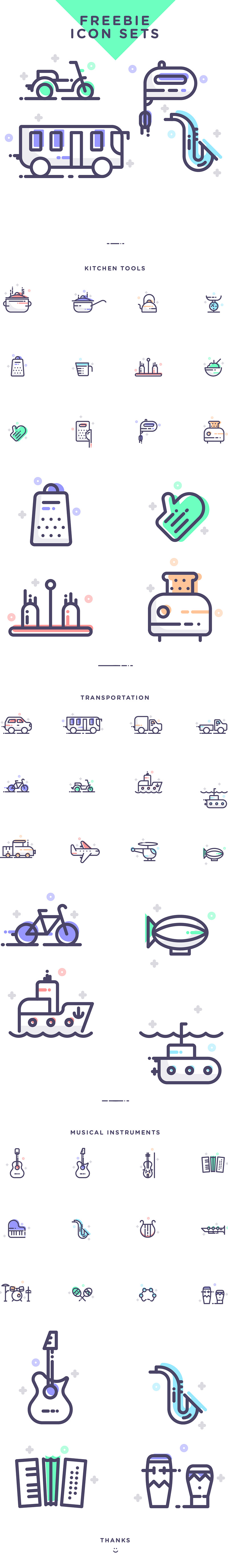 This bundle contains a total of 36 fun, colorful line icons made in Illustrator, they come separated in three categories with 12 icons each for transportation, kitchen, and musical instruments, and they are completely free for personal and commercial use.