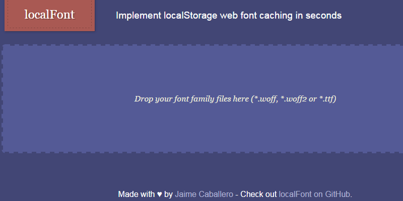 An online JavaScript tool that converts your font family files into a ready to use solution for localStorage web font caching. To use it, just drop the font files and set up each font’s style and weight, and finally grab the code that will be automatically generated. It is released under the MIT license, and it was created by Jaime Caballero.