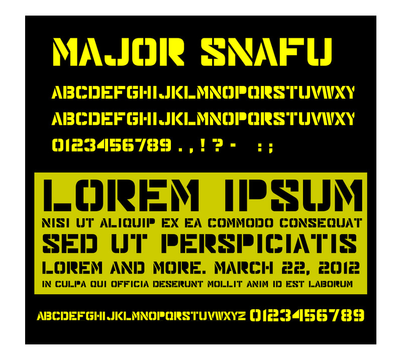 Major Snafu is an All Caps Stencil typeface with a strong yet modern looking style. It includes accented letters, numbers and special characters