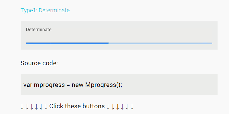 Mprogress.js is a JavaScript library that creates a material design-alike progress bar to place it at the top or at the bottom of the page. It uses CSS3 and pure js, and does not depend on any other libraries, and you can create 4 types of bars. This library was made by GC Tang.