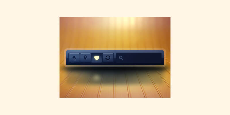 This mini navigation bar user interface in dark colors and glossy finish is completely organized and has all the items as smart objects, for maximum editability. It is a minimal blue bar, perfect for a mobile app. It includes icons for recording audio, location, liking and repeating, besides the search bar.