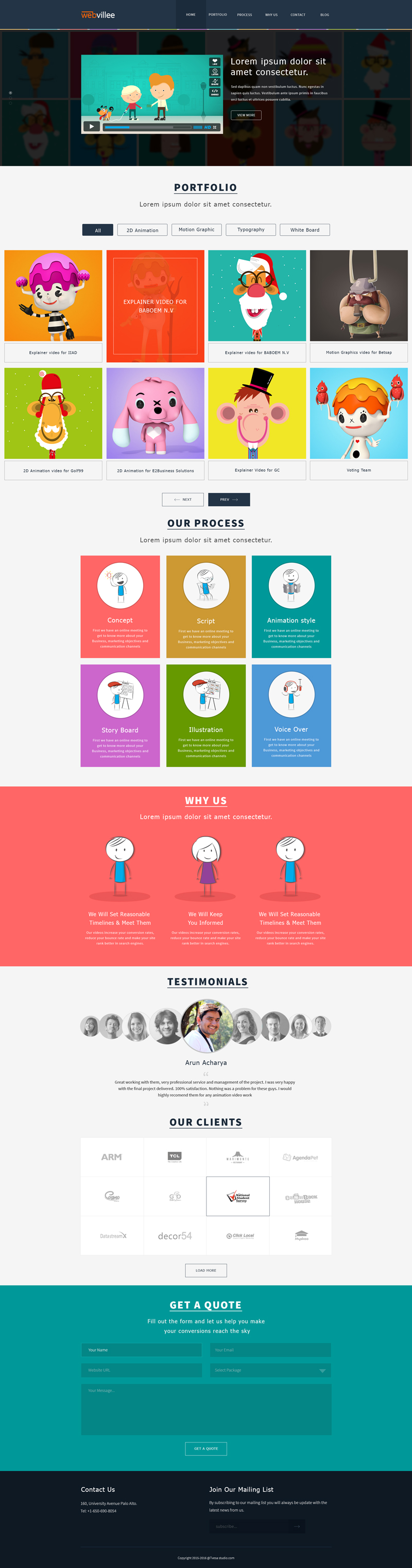 A one-page 12 column grid template that features six sections laid across the page, these are home, portfolio, our process, why us, testimonials, our clients, get a quote and contact.