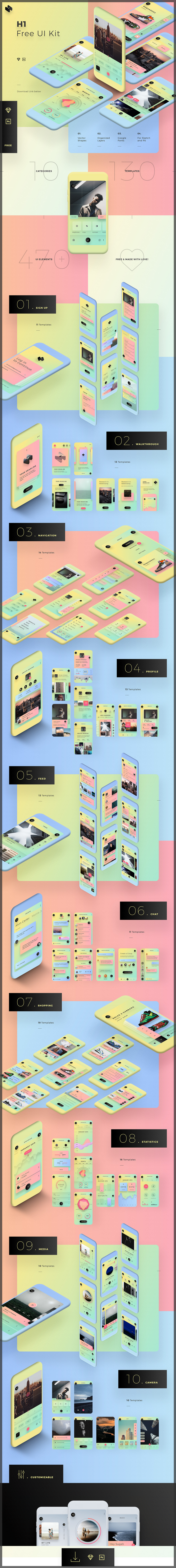 A brand new mobile UI kit created by Behance user Hristo Hristov with over 470 UI elements, 10 categories and over 130 templates to get inspiration from. Categories include sign-ups, walkthroughs, navigation, profiles, chat, shop, and more.