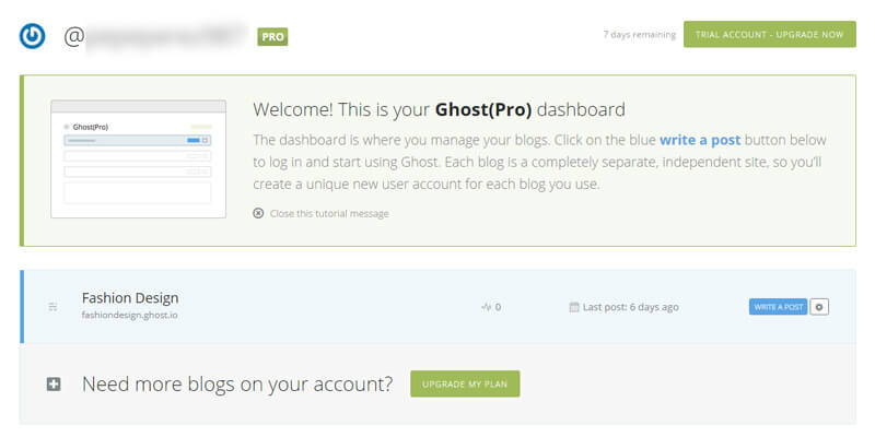 Ghost is a clean blogging platform that features a very nice posts dashboard and also each blog is a completely separate, independent site. For this reason, a new user account is needed for each blog you use. Town square is one good example of a blog created with it.
