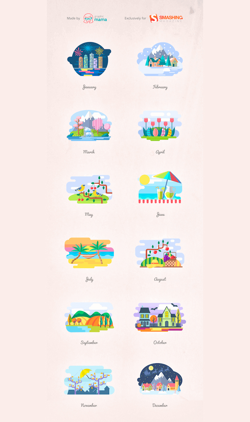 A collection of 12 flat geometric designs available in PNG, SVG, EPS and Ai formats with a maximum dimension of 1080x841px, depicting every month of the year. You can modify the size, color and shape of the icons thanks to its vectors. The zip file is really lightweight.