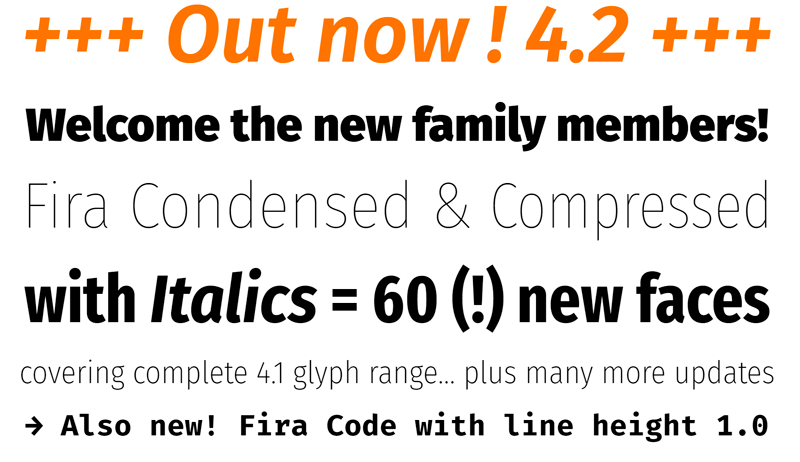 Fira Sans is Mozilla’s open source type family. The version 4.2 comes with Fira condensed and compressed, also with italics and 60 new faces. The line height is now 1.0 for Fira code. The file is 95 MBs.