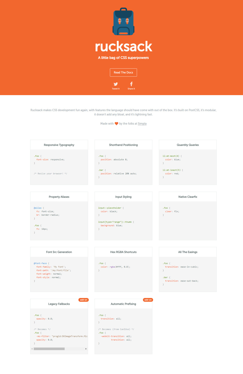 Rucksack is a CSS library that features responsive typography, quantity queries, property aliases, input styling, and more characteristics that allow CSS development to be easier.