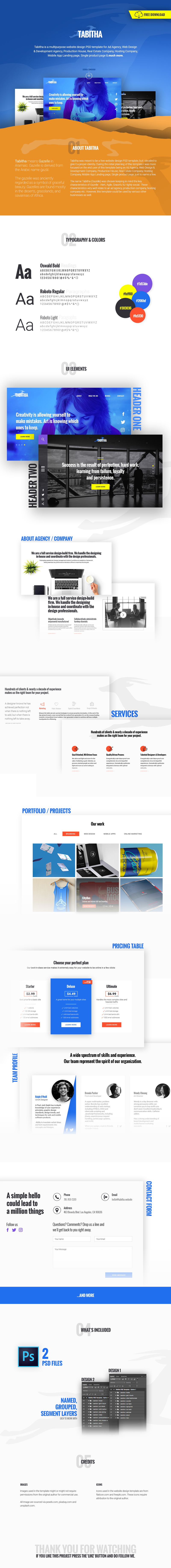 Tabitha is a multipurpose website template made in Illustrator and Photoshop for an ad, web design & development agency, or just to showcase mobile apps in a beautiful landing page. It is an organized document, with properly named layers, and icons.