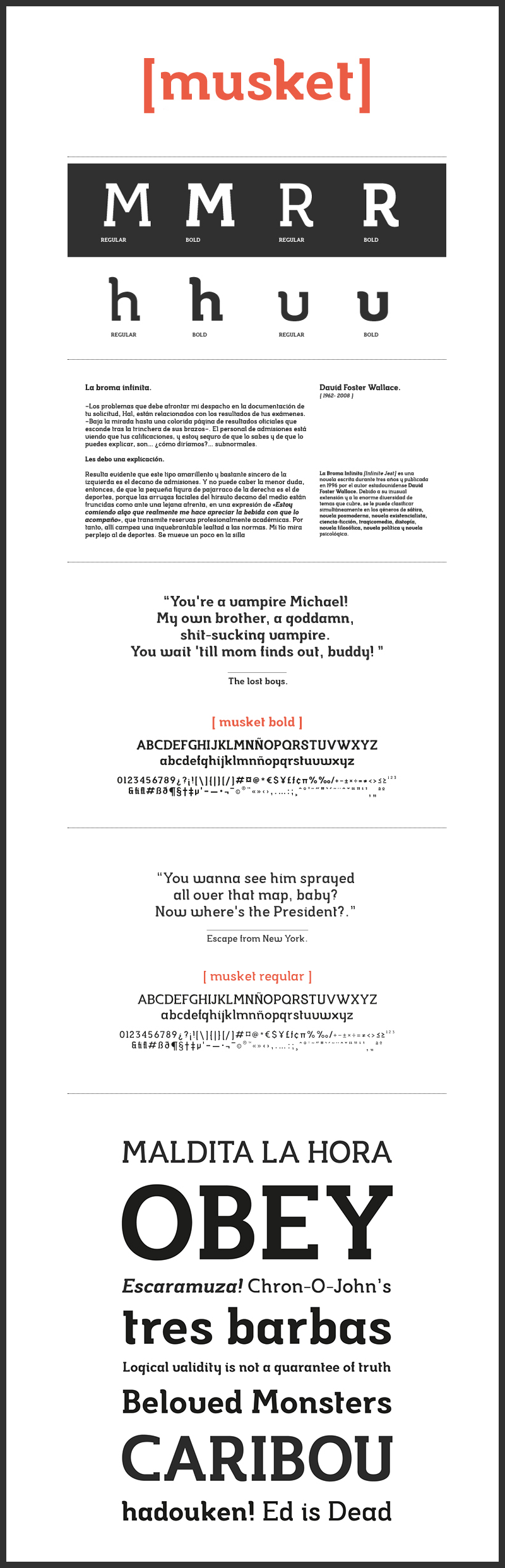 Musket is a rebound of the Musket Free Font that includes regular, bold italic and bold italic types. It is a Slab Serif font with strong endings, legible and easy to integrate into any project, whether it is print, digital media or a mobile app. It includes latin characters.