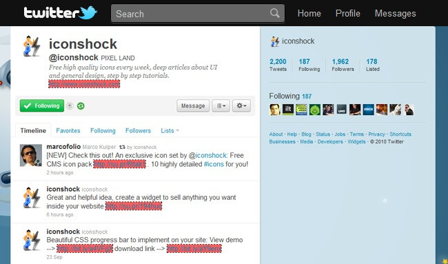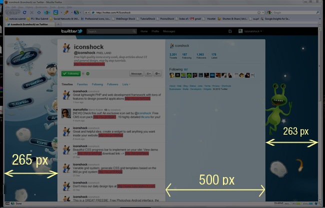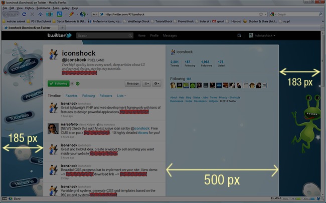 But there’s still an issue that we need to figure out, and it’s the background thing. With the new Twitter interface, many backgrounds have become obsolete as they don’t fit inside the new empty areas of the layout, which has became more proportional and also gives more relevance to the information. Just to see an example, let’s check the Iconshock’s profile at different resolutions.