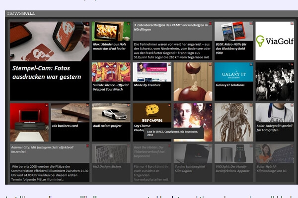 Just like on a “news wall” all messages – sorted by date and time – show up in small blocks, if possible together with an image. That way it is easy to find the most important and interesting news and then have a closer look at these.