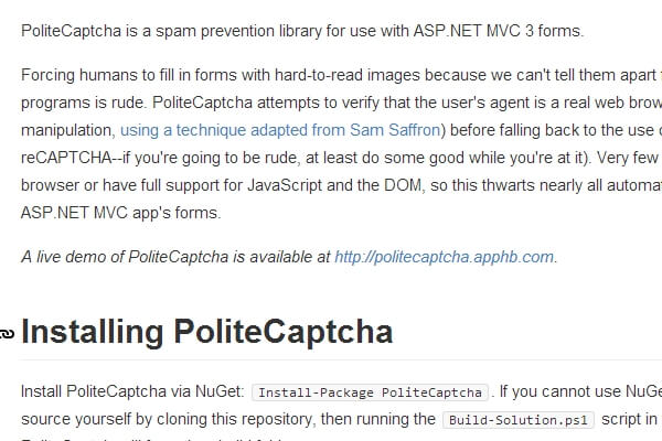 PoliteCaptcha is a spam prevention library for use with ASP.NET MVC 3 forms. Forcing …