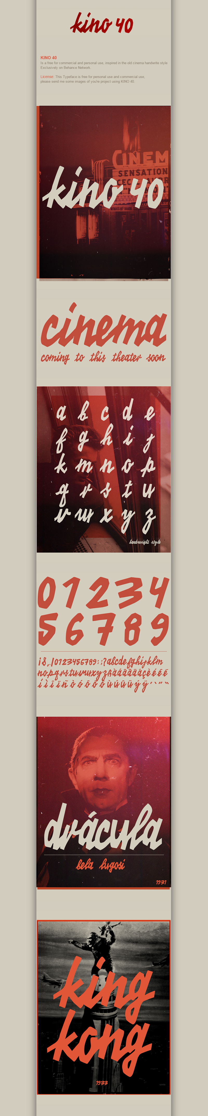 Kino 40 is a typeface inspired by old cinema handwrite styles; the font includes uppercase, lowercase, numbers and lots of special characters.