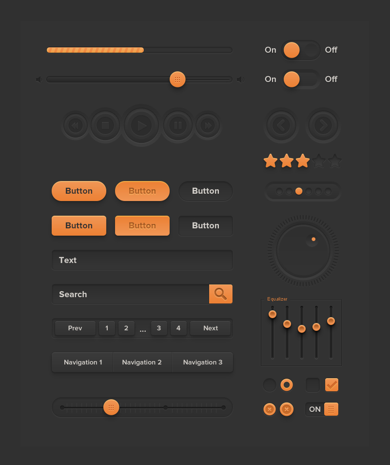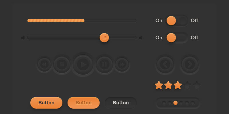 A set of user interface elements that allows you to inject a bit of life into your web design while keeping a mainly solid look. This is achieved with a dark background and bright, orange interactive elements. The progress bar features candy-bar styling and the dark buttons have a smooth 3D-like shadow.