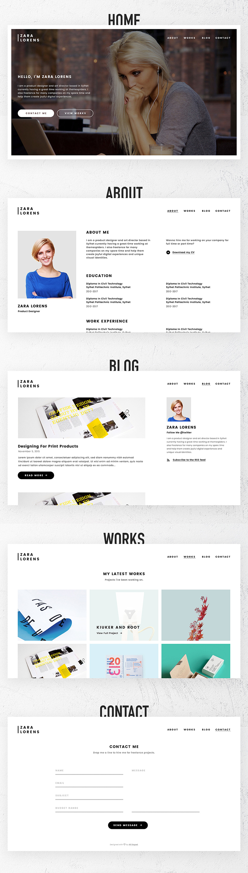 A personal portfolio website template that will help you a lot at the moment of introducing your work to the world. Well-differentiated categories like home, works and contact are on the main template page.