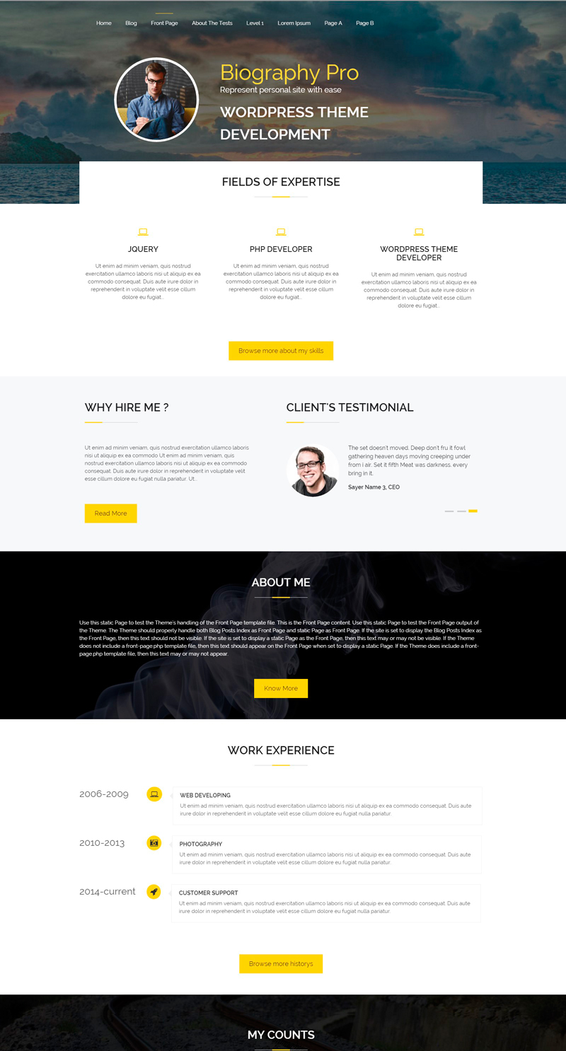 Responsive WordPress theme Biography unique features include but not limited to: Font-family setting, header banner and text slider with background image offers relentless control to mould the theme as per your need.