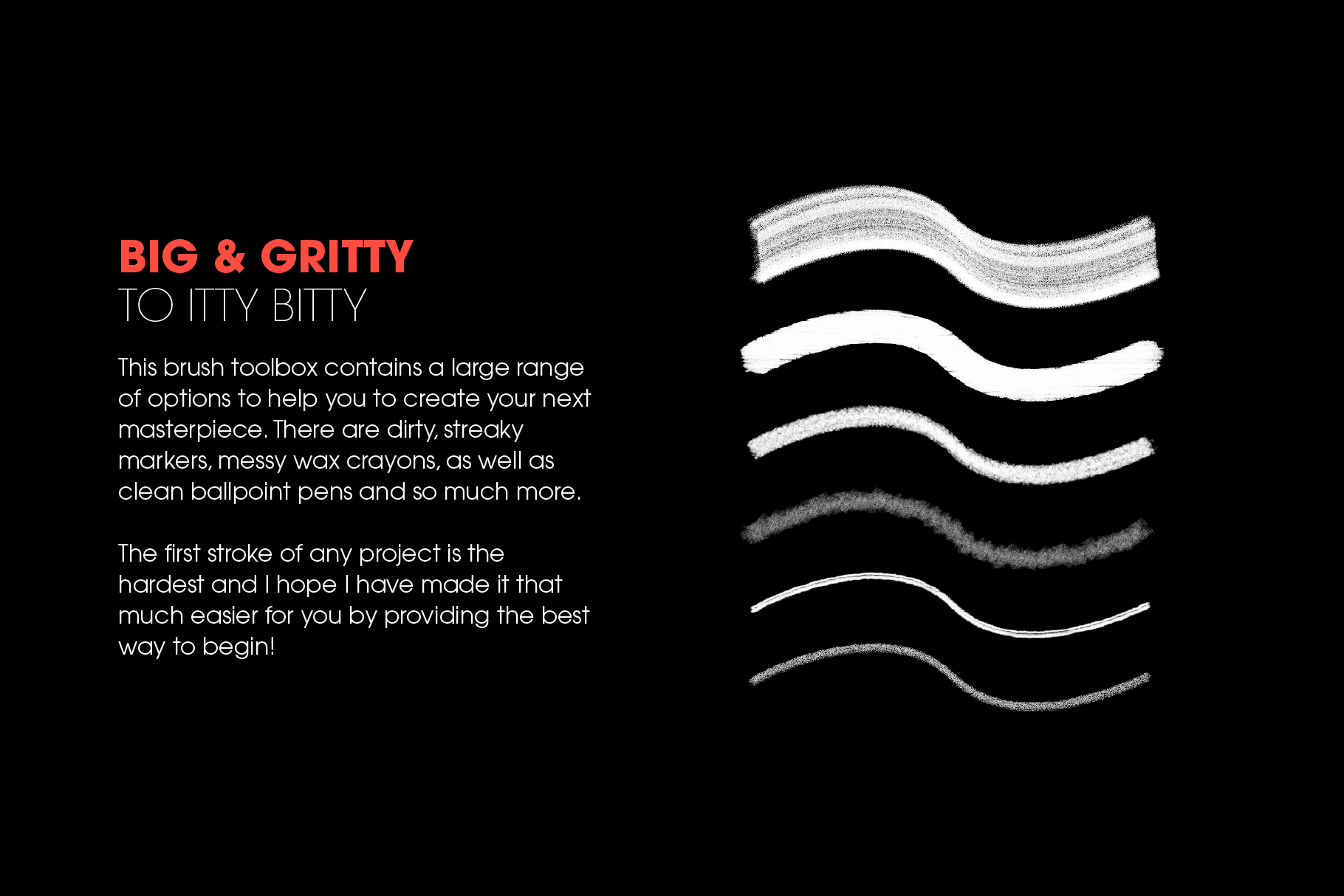 - Gritty, scatter, clean pen strokes, halftones, watercolor & more